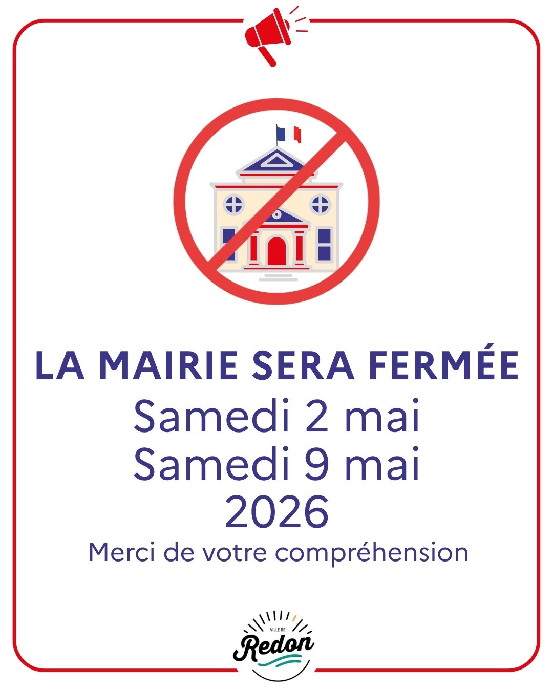 La mairie sera exceptionnellement fermée au public les samedis 2 mai et 9 mai 2026.