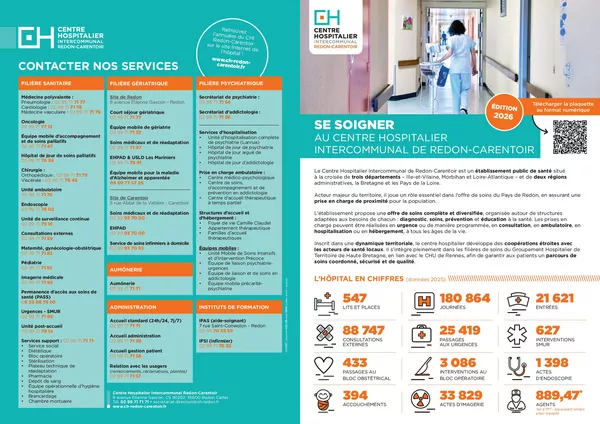 Le centre hospitalier de Redon-Carentoir propose une large gamme d’activités et de ressources à travers des structures de soins adaptés et de proximité pour le diagnostic, les soins, la prévention et l’éducation à la santé.